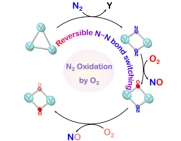 如图一所示,首先Y3+断裂N≡N三键生成Y2N2+,N2活化的电子主要来自Y原子。在与第一个O2分子的反应过程中,存储在两个N原子中的电子被逐渐释放,通过N−N键的重新形成和再断裂来还原O2分子,同时释放产物NO。在和第二个O2分子反应时,剩余的N原子充当电子供体还原O2分子,释放第二个NO分子。因此,可逆的N−N键开关作为一个有效的电子库,驱动了N原子的氧化,导致NO分子的形成。这种通过N2和O2分子直接偶合产生NO的策略,即“可逆的N−N键开关”,可能为直接合成NO并进一步制备HNO3提供了一种全新的方法。
