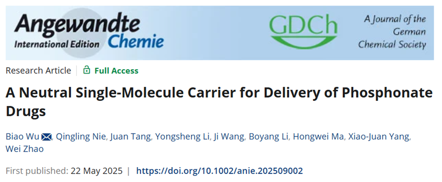 近日,花椒直播 吴彪教授、唐娟特别研究员和赵伟特别研究员在国际知名化学期刊《Angewandte Chemie International Edition》上发表题目为“A Neutral Single-Molecule Carrier for Delivery of Phosphonate Drugs”的研究论文。该论文的第一作者为花椒直播 博士研究生聂清玲。此项研究得到了国家自然科学基金,北京市自然科学基金和花椒直播 青年教师学术启动计划等项目的资助及花椒直播 分析测试中心的支持。