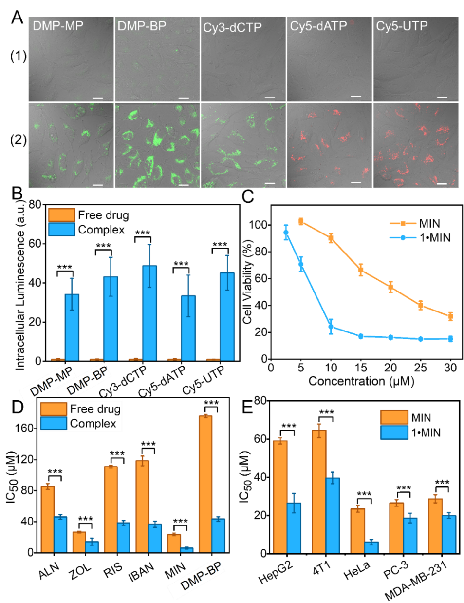 为评估cage 1对PDs的递送效果,本研究首先测试了cage 1对多种肿瘤细胞(如HeLa、HepG2、MDA-MB-231、PC-3和 4T1)的细胞毒性,即使在100 µM条件下,细胞存活率仍显著高于安全阈值,凸显其优异的生物相容性。本研究首先采用荧光标记的单磷酸盐、双膦酸盐(BPs)及三磷酸盐作为模型药物,通过共聚焦显微镜直观展示了复合物的胞内积累效果。结果显示,cage 1žPDs复合物处理的细胞其荧光强度较游离药物组显著增强了33~45倍(图3A, 3B),文献中带正电荷的环糊精递送的PD在MCF7细胞中的荧光强度只提高了5倍。抗肿瘤细胞增殖实验进一步证明,相比起游离的双膦酸盐,cage 1递送的双膦酸盐对肿瘤细胞对肿瘤细胞的增殖抑制效率提升2-4倍(图3C, 3D),且该效果在多种细胞系中均保持一致(图3E)。相较于与原药酯化(提高1.3倍)或非靶向单功能双膦酸盐纳米载体(效果忽略不计),cage 1展现更优越的递送效率。cage 1通过精准PD药物负载与可控释放,为改善磷/膦酸盐类药物的临床疗效提供了可靠依据。