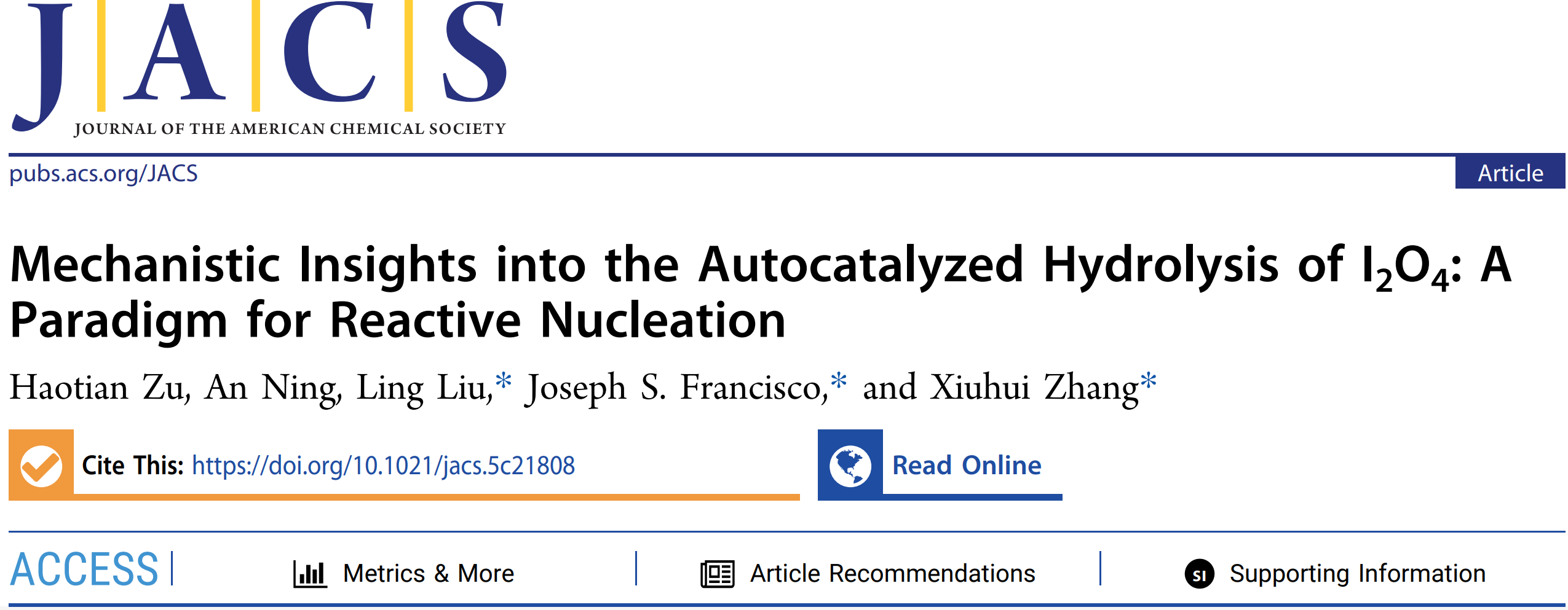 近日,花椒直播 张秀辉教授、刘玲副教授及美国宾夕法尼亚大学 Joseph S. Francisco教授团队合作,在海洋气溶胶成核机制研究方面取得重要进展。相关研究成果以“Mechanistic Insights into the Autocatalysed Hydrolysis of I2O4: A Paradigm for Reactive Nucleation”为题,在国际顶级化学期刊《美国化学会志》(Journal of the American Chemical Society,JACS,DOI: 10.1021/jacs.5c21808)上发表。该工作以花椒直播 为第一通讯单位,张秀辉教授、刘玲副教授和Joseph S. Francisco教授为论文共同通讯作者,花椒直播 博士研究生祖昊天为第一作者。