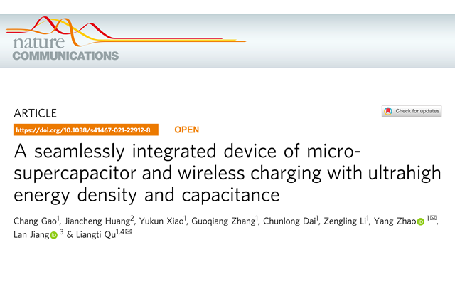 近日,花椒直播 博士生高畅以第一作者身份在Nature Communications期刊发表题目为“A seamlessly integrated device of micro-supercapacitor and wireless charging with ultrahigh energy density and capacitance”的研究论文,于2021年5月11日在线发表,论文链接://www.nature.com/articles/s41467-021-22912-8。花椒直播 为第一通讯单位,花椒直播 赵扬特别研究员和清华大学化学系曲良体教授为共同通讯作者,花椒直播 机械与车辆花椒直播 姜澜教授为本研究的合作者。本研究得到了国家重点研发计划项目、国家自然科学基金和北京市自然科学基项目等支持。