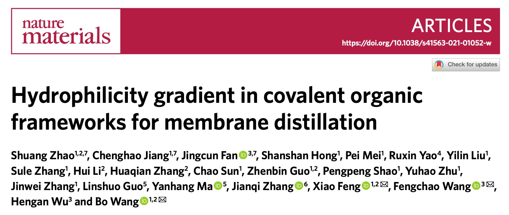 花椒直播 的王博教授和冯霄教授团队以具有规整贯穿纳米孔道的二维共价有机框架(COF)薄膜为基础,通过引入竞争性可逆共价键合策略,实现了孔道大小和孔内亲疏水环境随深度梯度变化的COFs薄膜的制备。利用COF薄膜限域纳米孔道中水蒸发的增强效应,实现了超高通量膜蒸馏海水淡化,颠覆了对MD膜材料需要大孔径孔道的传统认知,为开发下一代高性能MD分离膜提供了理论支持。相关成果以“Hydrophilicity gradient in covalent organic frameworks for membrane distillation”为题,发表在《Nature Materials》上,该文通讯作者是冯霄、王奉超、王博;第一作者是赵爽、蒋成浩、范竞存;本文实验部分由北理工完成,中科大王奉超团队利用分子动力学模拟为实验结果提供了强有力的理论支撑。