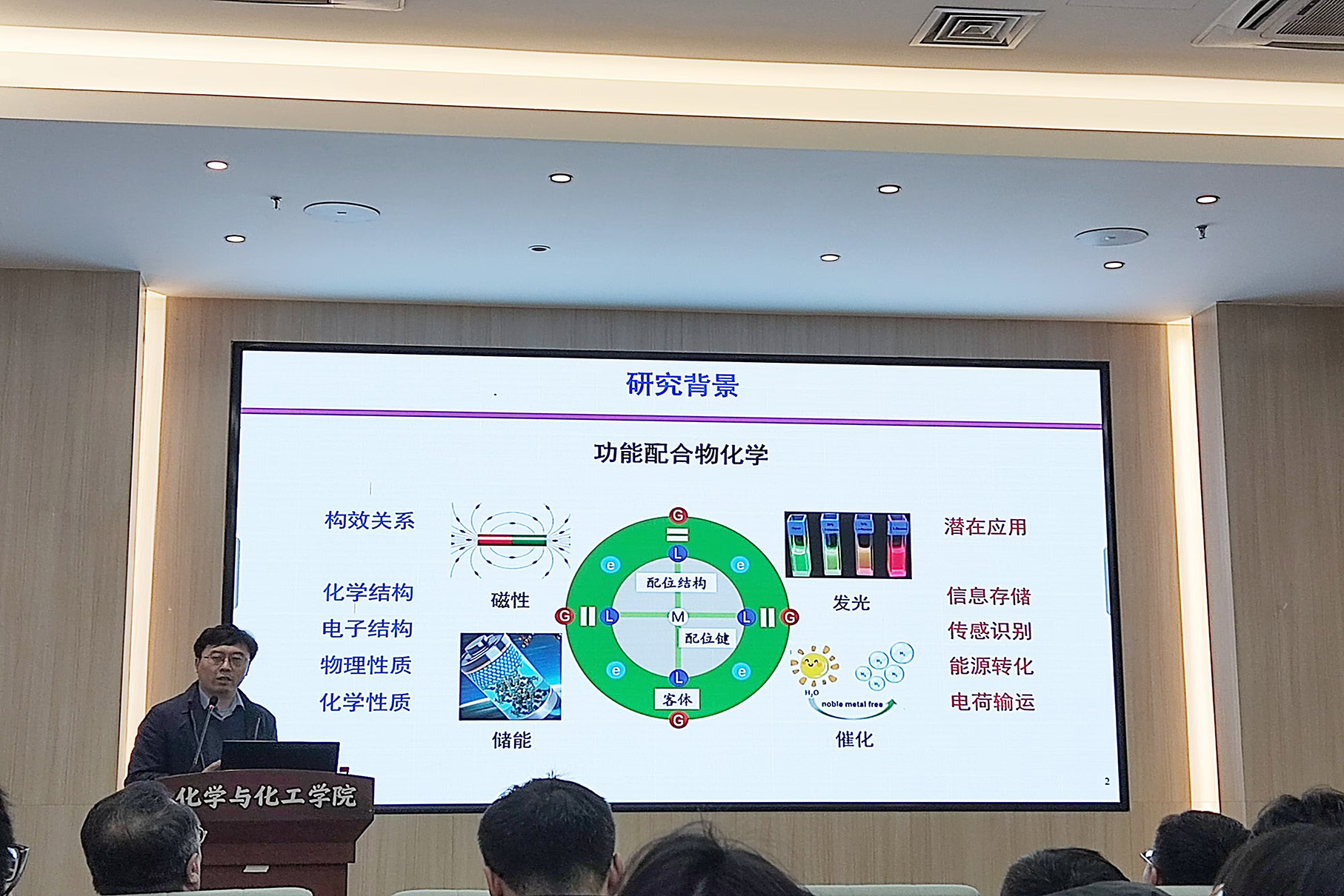 报告会上师教授主要围绕配合物的结构设计与功能调控,深入分析了多组分动态发光配合物的高效合成、分子和能级结构,并探讨了在外界刺激下其性质变化规律。报告内容主要包括以下几个方面:(1) 发展了一系列新型多中心功能配合物,阐述了通过精确调控多个关键体系组成和微孔结构,所获得配合物的合成规律和结构特征,为配合物的结构设计提供了新的思路和方法;(2) 探讨了多中心动态发光配合物作为高效传感材料的应用前景,通过构效关系的系统分析,揭示了不同结构单元之间的相互作用及其对材料性能的影响。