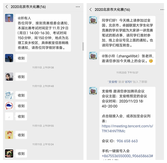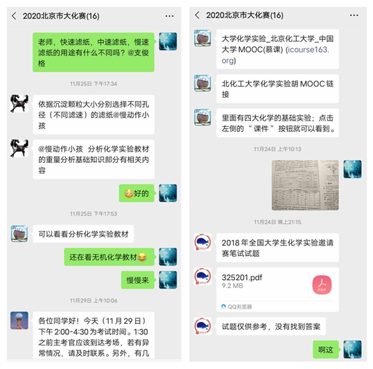 参赛的各位同学们在潜心准备的同时,花椒直播 也组织曾参加过全国、北京市、卓越杯大学生化学竞赛并取得优异成绩的、有经验的学长学姐为参赛同学进行线上培训与指导,比赛前,在微信群中随时为参赛同学答疑解惑。