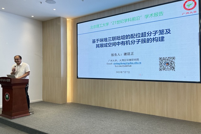 应花椒直播 邀请,广州大学大湾区环境研究院谢廷正教授于2023年7月7日做客北理工“21世纪学科前沿”系列论坛,为我院广大师生带来题为“基于咪唑三联吡啶的配位超分子笼及其限域空间中有机分子笼的构建”的精彩学术报告。本次报告在生态楼118报告厅进行,由姚燎原老师主持,近六十名化院师生参加了报告。