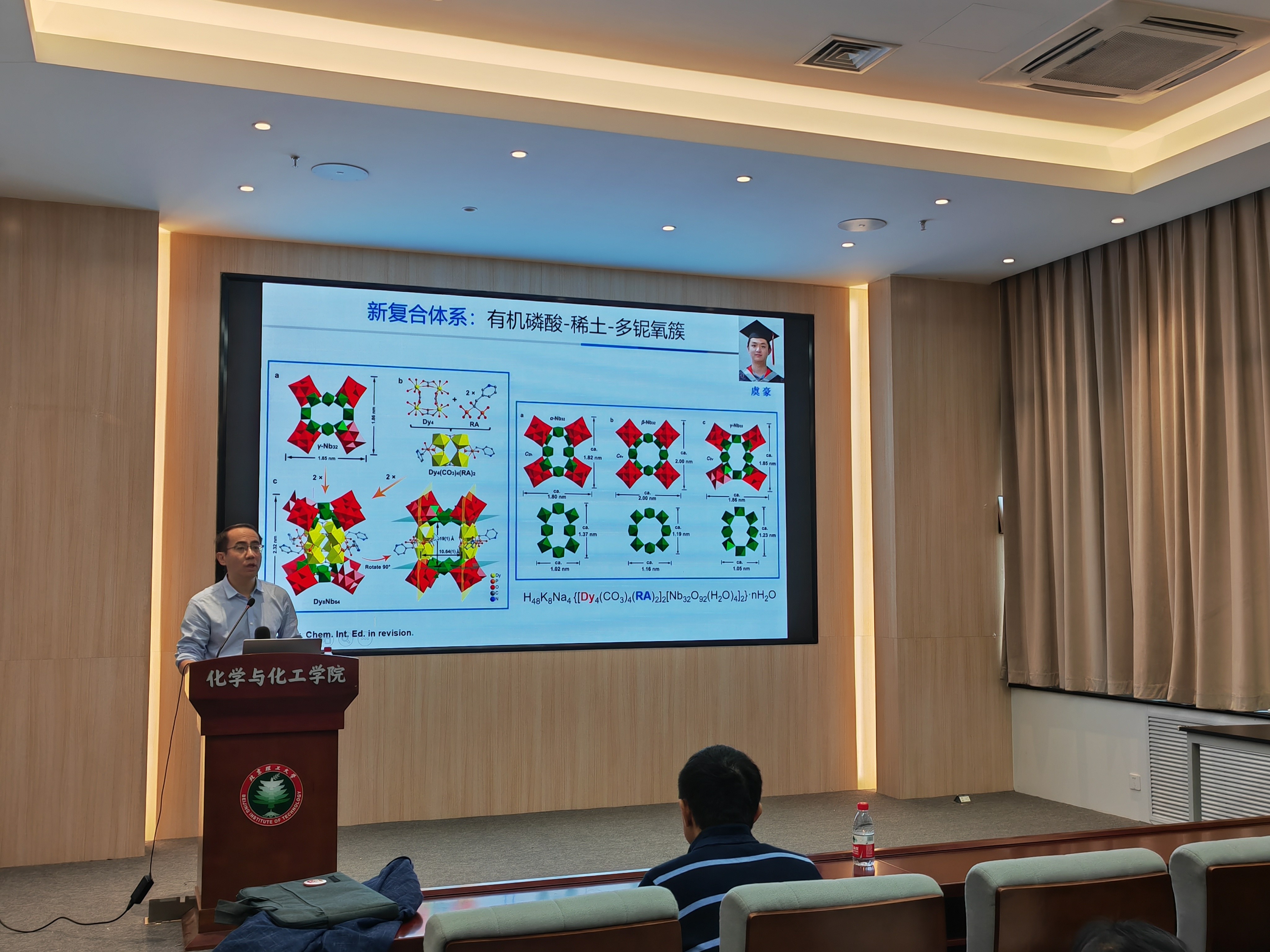 应花椒直播 邀请,福州大学郑寿添教授于2023年10月26日09:00做客北理工“百家大讲堂”,为我院广大师生带来题为“多铌氧簇化学”的精彩报告。本次报告在生态楼118会议室进行,由黄胜利老师主持,近六十名化院师生参加了报告。