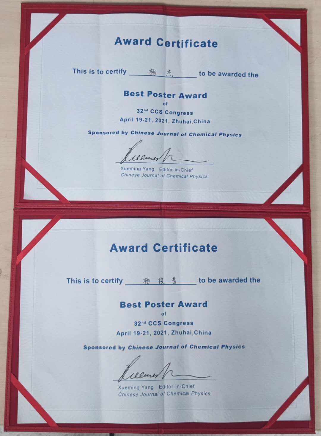 在第24分会(化学中的量子与经典动力学),李全松教授受邀作了题为“光致变色有机硼化合物反应机理的理论研究”的邀请报告,陈世稆教授、谢静教授、郑小燕副研究员作了口头报告,题目分别是“单双核铁酶C-H键活化微观调节机制”“ 直接动力学模拟单水合过氧氢根离子与甲基氯的反应动态过程”“AIE材料结构与性能关系的多尺度模拟研究”。参会研究生以墙报形式展示了自己的科研成果,博士研究生杨杰和硕士研究生杨俊芳获得优秀墙报奖。