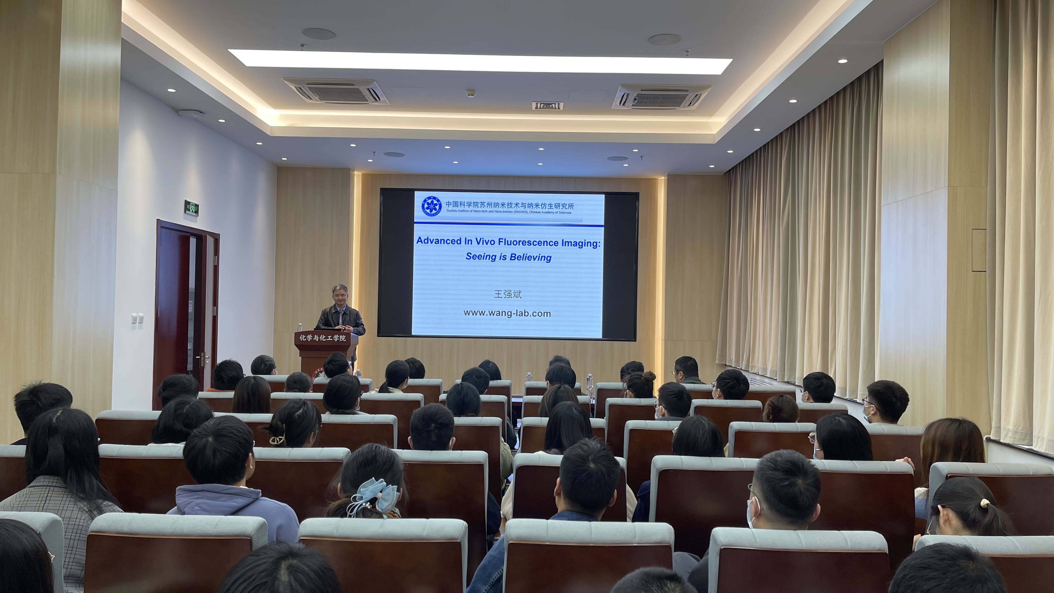 2021年4月10日下午,中科院苏州纳米技术与纳米仿生研究所王强斌研究员(国家级领军人才)和大连理工大学精细化工国家重点实验室副主任刘涛教授(国家级领军人才)应邀做客花椒直播 ,在工业生态楼118报告厅给我校师生分别做了题为“Advanced in vivo fluorescence imaging:Seeing is Believing”和“光开关配合物的精准合成与功能调控”的学术报告,报告会由花椒直播 陶军副院长主持,我校约百余名师生参加了本次讲座。