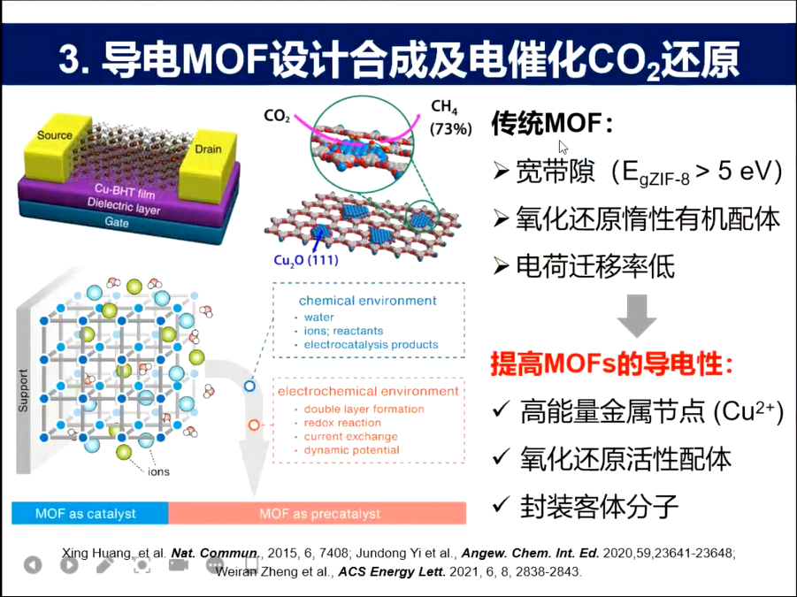 在世界经济论坛“达沃斯议程”对话会上习近平主席特别致辞,宣布中国在2030年前二氧化碳达到峰值,2060年前实现碳中和。基于当前能源和绿色发展的大背景下,吕永琴教授深入介绍了碳中和关键技术中生物催化转化CO2的科学挑战和研究策略。吕永琴教授首先介绍了第一部分:MOF/COF混合基质膜构建与CO2分离。先是提出拟解决关键科学问题如何提高有机相和无机相的界面相容性,提高填料的分散性,打破聚合物膜的“trade-off”效应,然后介绍了两种解决方法,即基于可聚合MOF构建混合机制膜和“自上而下”原位合成MOF/COF混合基质膜。随后吕永琴教授介绍第二部分基于介孔MOF限域微环境调控酶催化。MOF的孔径小于2 nm,酶在3-5 nm之间,通过扩大MOF的孔径可以实现酶的固定化。传统方法是共沉积包埋酶和通过延长配体尺寸增加孔径,但是传统方法合成繁琐,容易塌陷、普适性差。基于此,吕永琴教授介绍团队提出的两种新方法:第一种方法是基于水凝胶模板构建介孔MOF,三聚氰胺和水杨酸乳化冷却在氢键驱动下形成水凝胶纳米纤维,加入有机配体,再升高温度脱除水凝胶,形成微介孔HMOF;第二种方法是基于物理痕迹构建介孔MOF、酶、金属离子和有机配体自组装形成酶-MOF复合物,再煅烧脱除酶模板形成微介孔HMOF。吕永琴教授介绍第三部分内容是导电MOF设计合成及电催化CO2还原。可以通过高能量金属节点,氧化还原活性配体和封装客体分子来提高MOFs的导电性。设计角度主要是物理角度的能带理论和化学角度的通过价键。最后吕永琴教授总结了本次讲座三个部分,设计合成MOF/COF混合基质膜实现CO2的分离捕集,基于介孔MOF限域微环境调控酶催化和设计合成导电MOF实现电催化CO2还原。