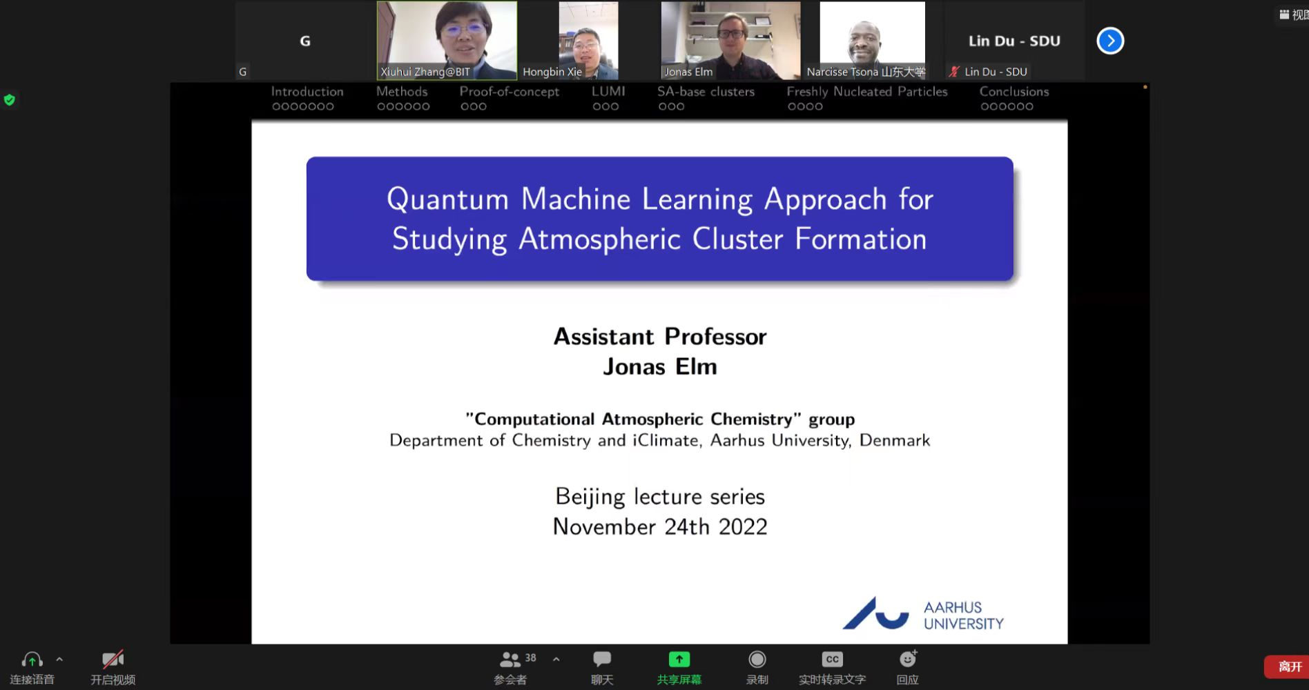 2022年11月24日下午,由花椒直播 研究生院主办,花椒直播 承办的北理工“21世纪学科前沿”系列讲座在腾讯会议线上举行。应花椒直播 张秀辉教授的邀请,奥胡斯大学Jonas Elm助理教授做了题为“Quantum Machine Learning Approach for Studying Atmospheric Cluster Formation”的学术报告。近四十名师生参加了讲座并进行学术交流。