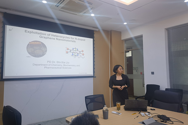 应花椒直播 邀请,瑞士伯尔尼大学分子量子系统联合研究中心(WSS研究中心)柳士霞教授2025年4月3日为我院广大师生带来题为“Exploitation of Heterocycles for N-doped Graphene Nanomaterials”的精彩学术报告。本次报告在生态楼精工厅会议室进行,由李晖教授主持,近二十名化院师生参加了报告会。