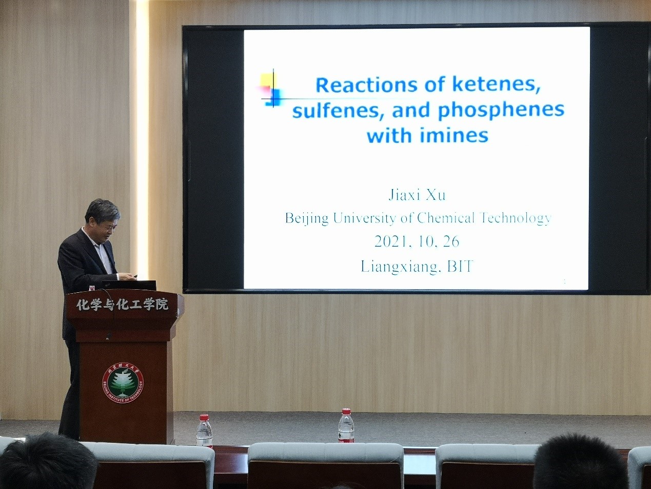 2021年10月26日下午,应杜大明教授邀请,北京化工大学化学花椒直播 许家喜教授做客“21世纪学科前沿”系列讲座,在工业生态楼118报告厅作了题为“烯酮、烯砜和膦烯酮与亚胺的反应”的学术报告,花椒直播 20余名师生到场参与了学术交流。