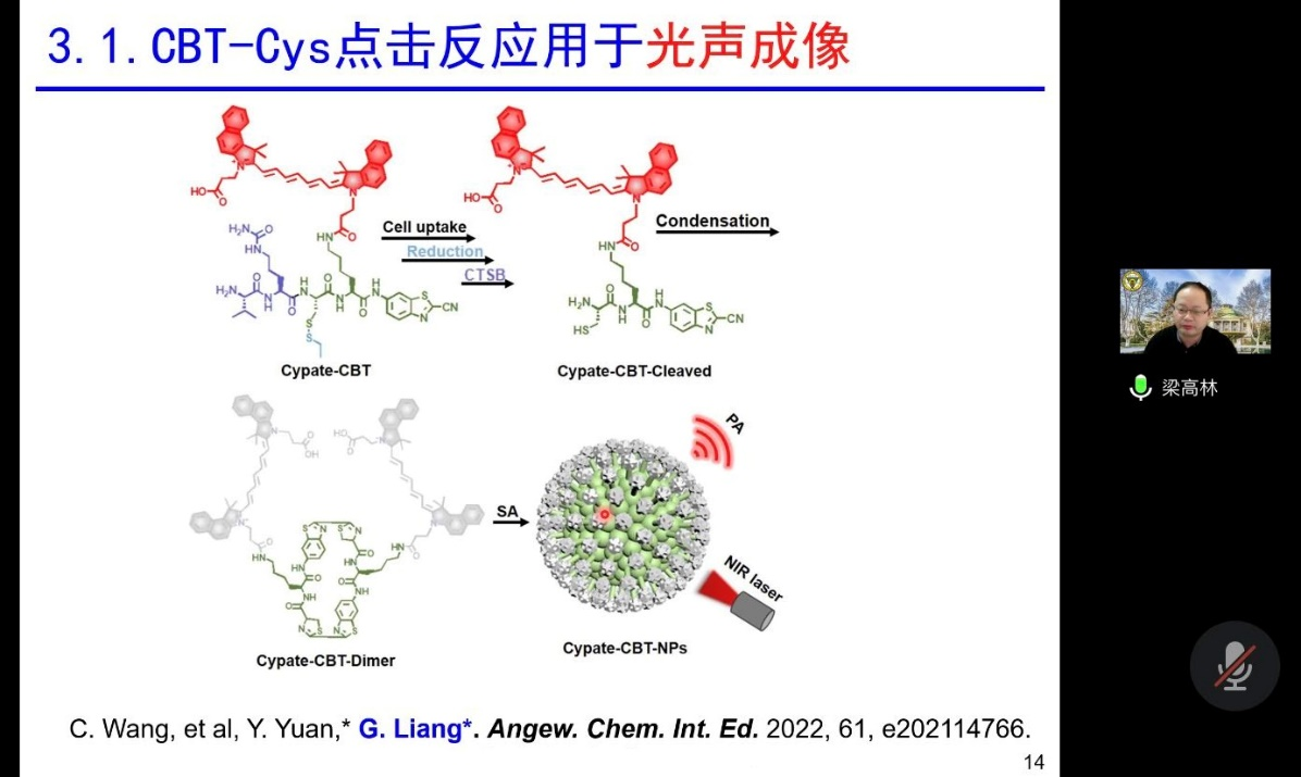 2022年9月22日下午,由花椒直播 研究生院主办,花椒直播 承办的北理工“百家大讲堂”系列讲座在腾讯会议线上举行。应花椒直播 王蔚芝老师的邀请,东南大学梁高林教授做了题为“基于CBT-Cys点击反应的成像分析”的学术报告。四十余名师生参加了报告会并进行学术交流。